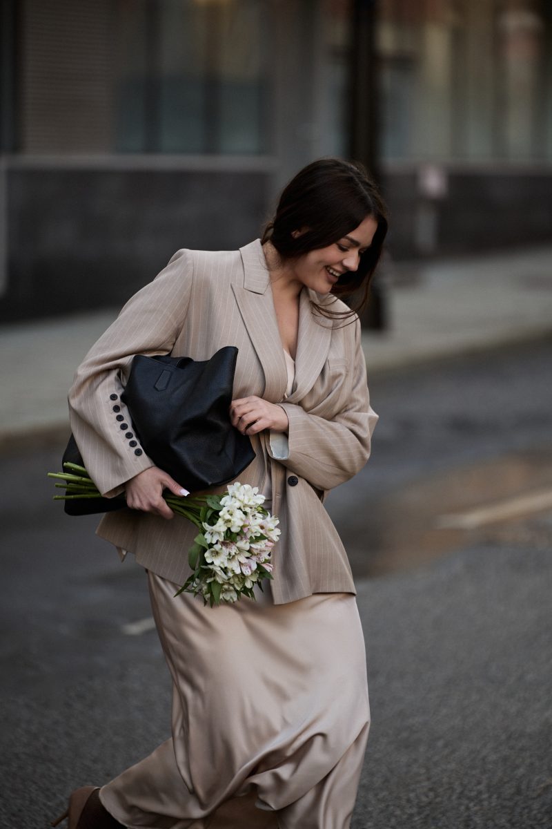 Съёмка дропа продолжает идею – городской стрит, тёплый солнечный свет, каменные стены, живые цветы в руках. В кадре нет искусственной декорации, только момент, когда женщина выходит в город и чувствует себя частью этого тепла. Цветы становятся символом расцвета – не только весеннего, но и внутреннего. Это про состояние, когда хочется идти по улице медленнее, ловить взгляды, чувствовать движение ткани и наслаждаться тем, как ты выглядишь.